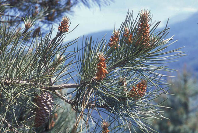 Gli aghi , lunghi circa 5 cm., sono inseriti in gruppi di due sui rametti, sono duri e pungenti, con il margine finemente dentato. Sono verdi con una tipica sfumatura azzurro-grigia, e sono leggermente attorcigliati, ritorti su sé stessi