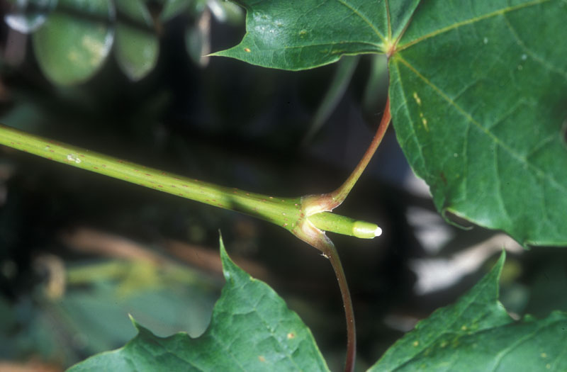 Le foglie, anche qui opposte, hanno solo tre grandi lobi con l’ apice ottuso e margini interi; la lamina fogliare è verde lucida superiormente, verde-glauco inferiormente.
