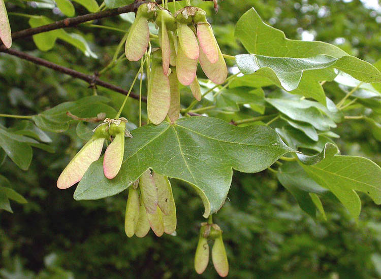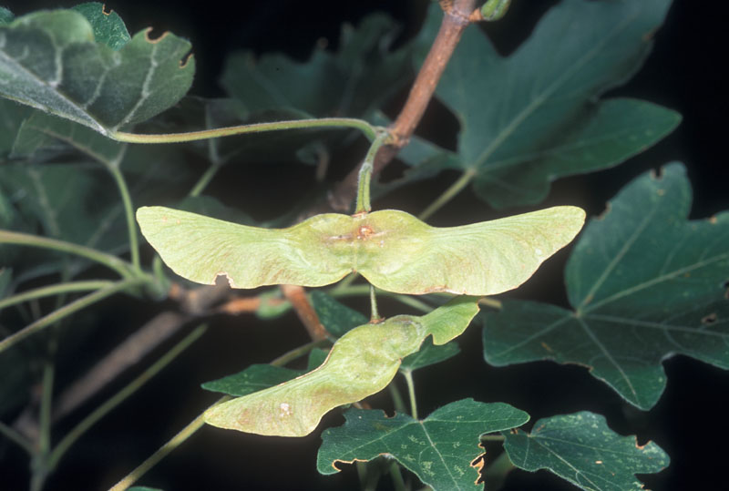 e per i frutti, disamare, cioè due samare unite una all’altra, portate dallo stesso peduncolo, ognuna con un seme e una lunga ala divergente simile a un’elica: quando i frutti maturi si staccano e cadono, vorticano nell’aria come le pale di un elicottero, rimanendo sospese per allontanarsi dalla pianta madre. L’angolo di divergenza delle sue samare è un buon carattere, unito agli altri, per identificare le diverse specie di aceri.