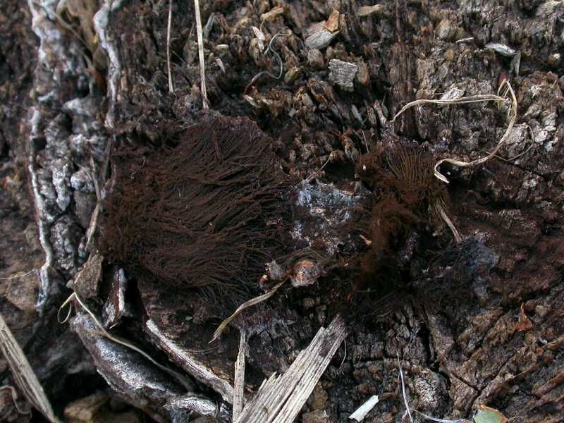 Ipotallo argenteo comune a tutta la fruttificazione. Gambi cavi. Se era una Stemonitis doveva essere veramente malridotta viso che con la lente non si vedeva traccia della rete esterna.