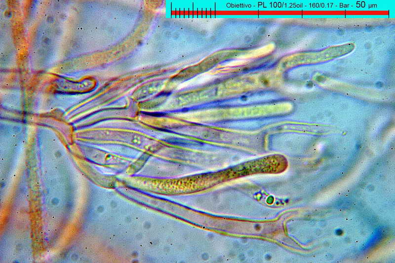 metabasidi e basidi a forma di diapason, giunti a fibbia assenti, anche se, alle volte si notano degli ingrossamenti, alla base dei basidi, che potrebbero far pensare a dei gaf.