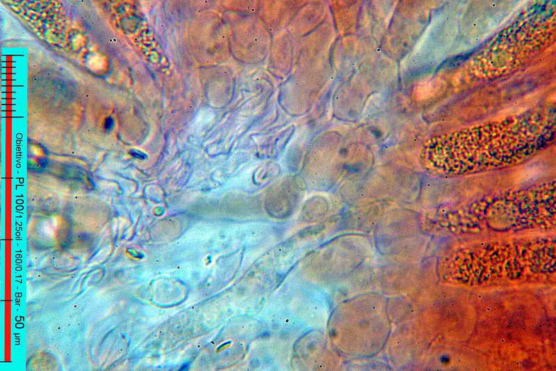 In foto, basidi, basidioli e albero imeniale strutturato, in maggioranza, con la cellula, dopo il basidio, dalla forma inflata.