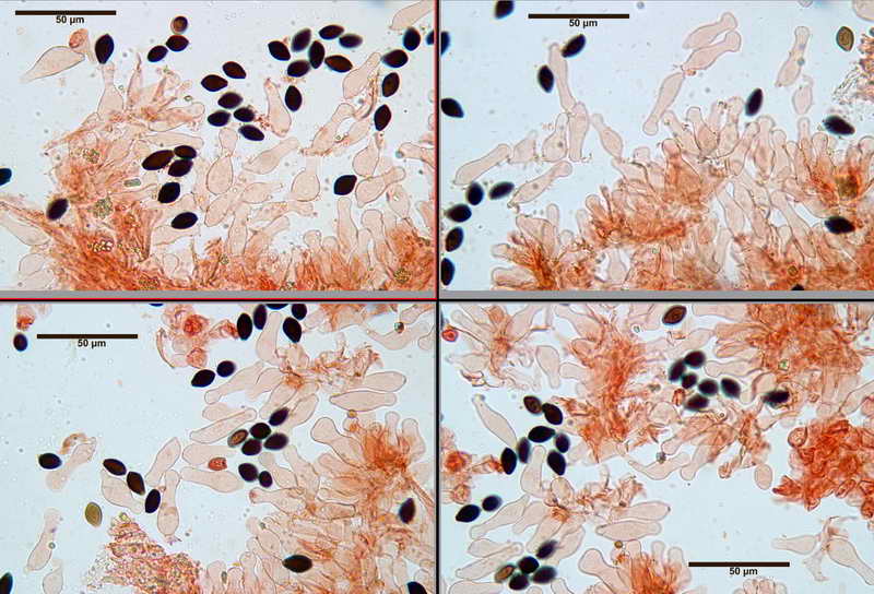 Trama lamellare regolare, formata da ife cilindriche, Ø 5-13 µm. Pleurocistidi assenti. Filo lamellare completamente sterile. Cheilocistidi (26,8) 27,05-36,24 (38,7) x (8,0) 8,72-12,87 (13,1) µm, testa Ø (5,1) 5,61-9,4 (10,0) µm, in media 32 x 10,6 x 7,6 µm, in massima parte lageniformi, molto spesso con apice capitato e con pedicello basale più o meno pronunciato, più raramente subfusiformi Pileipellis di tipo imeniderma, formata da cellule claviformi, 30,7-60,4 x 17,3-30,4 µm, finemente incrostate, più o meno peduncolate, pileocistidi non osservati. Caulopellis con ife esterne di Ø 2,5-5 µm, caulocistidi 28,5-40,5 x 9-11,5 µm, strettamente fusiformi, sublageniformi, subcilindrici e flessuosi, in genere non capitulati o solo in minima percentualGiunti a fibbia presenti in tutti i tessuti del basidioma seppur piccoli e difficili da individuare.