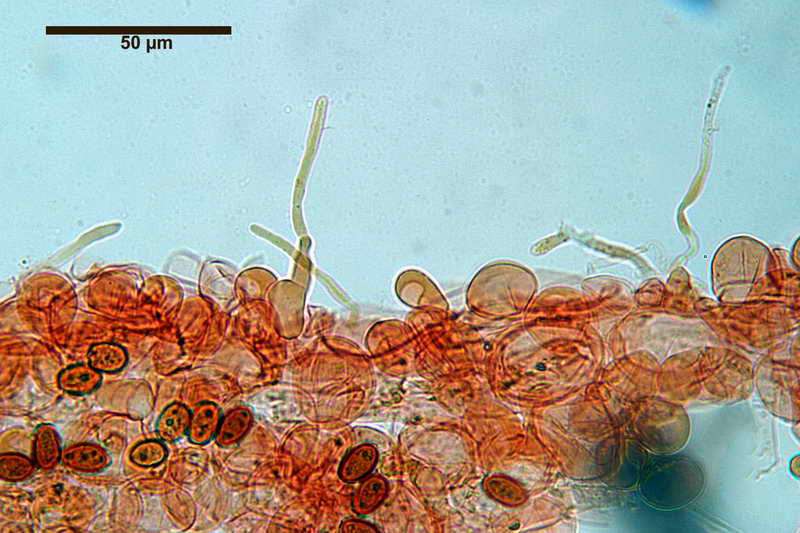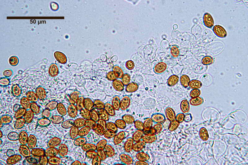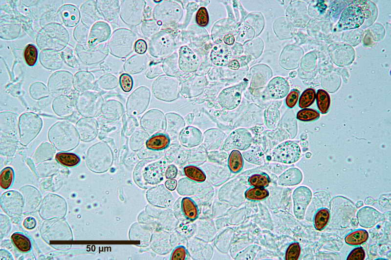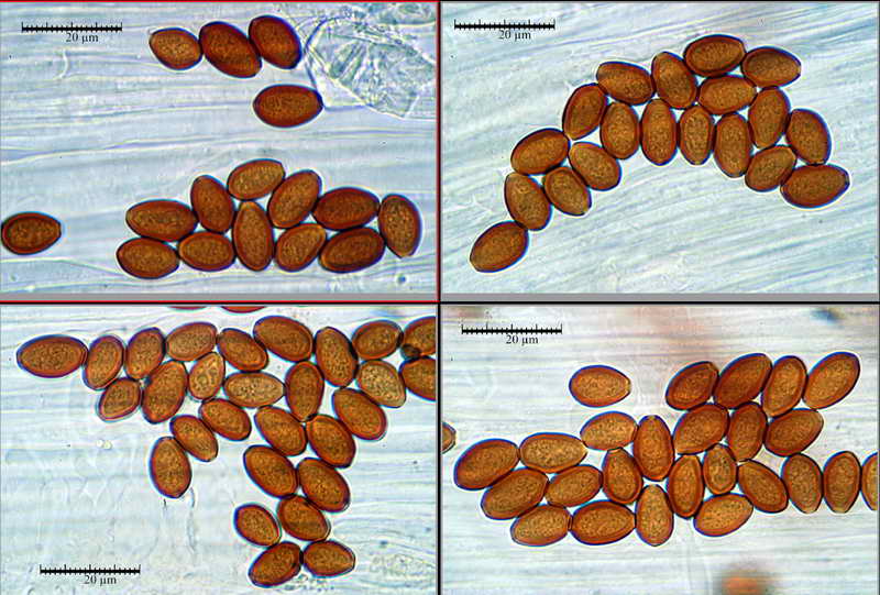 Spore; (11,6) 11,82-14,19 (14,7) x (6,8) 7,32-8,7 (9,1) x (7,8) 8,12-8,9 (9,0) µm, in media 13,3 x 8,1 x 8,5 µm, Q. = (1,5) 1,6-1,7 (1,9); Q.m.= 1,6; Vol. = (283,1) 335,1-566,76 (625,7); Vol.m.= 459,6; in proiezione laterale amigdaliformi con il lato adassiale un po' appiattito; in proiezione frontale largamente ovoidi; Con KOH 5% e con NH4OH 5% di colore marrone-rossastro al microscopio ottico lisce, con parete spessa 1-1,8 µm, poro germinativo centrale Ø, 1,5-2,2 µm, apiculo non evidente.