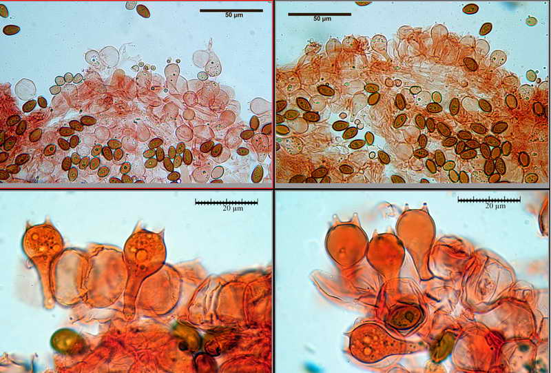 Cheilocistidi (19,8) 19,92-24,54 (24,6) x (6,0) 6,3-8,67 (8,7) µm, in media 21,7 x 7,8 µm; bulbillo Ø (2,9) 3,02- 4,63 (4,9) µm, in media 3,7 µm; collo (2,1) 2,16-4,99 (5,2) x (0,9) 0,93-1,47 (1,5) µm, in media 3,4 x 1,2 µm; lecitiformi, con base brevemente peduncolata, filo lamellare eterogeneo, formato da cheilocistidi frammisti a pseudoparafisi, clavate o sferopeduncolate 10,2-14,1 x 4,5-8,0 µm, in media 11,9 x 6,5 µm, pleurocistidi assenti.