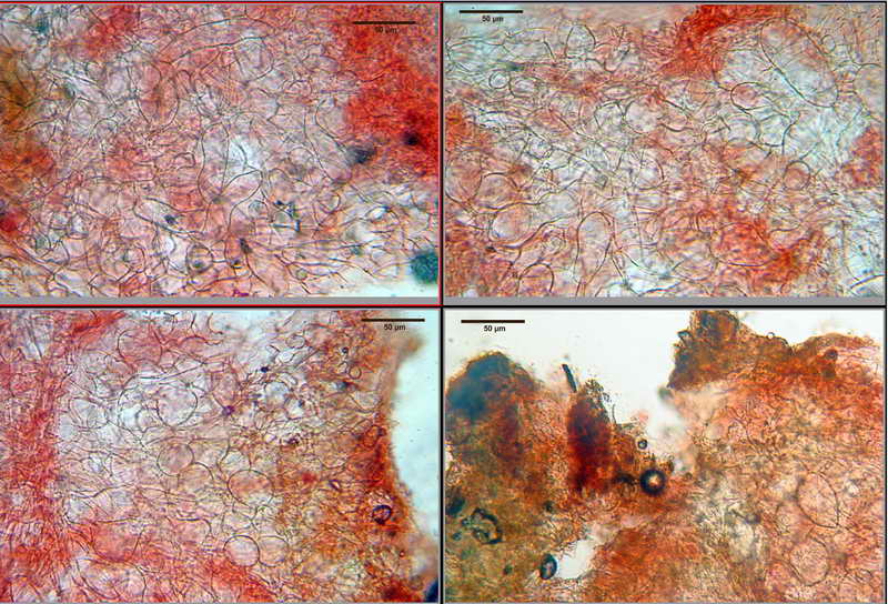 Strato carnoso: spesso 4-6 mm, formato da uno pseudoparenchima composto da cellule di forma subglobosa o pseudoparenchimatica, con Ø (25,4) 31,2-46,1 (47,2) µm, in media 38,26 µm, mutanti in ife inflate ed a forma di salsicciotto misuranti 55,9-120,8 x 21,5-46,0 µm, in media 91,1 x 27,7 µm, man mano che ci si avvicina verso la zona a contatto con lo strato fibroso.