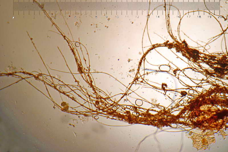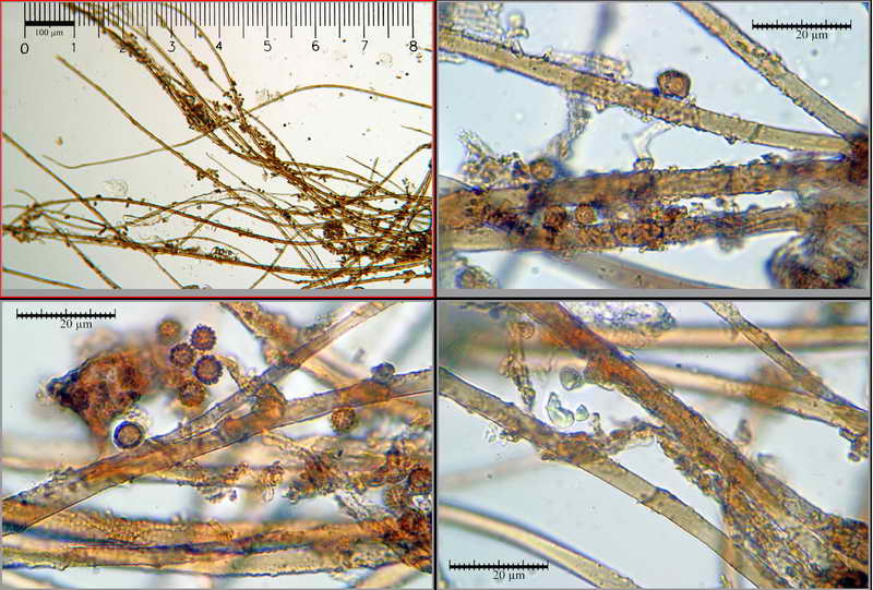 Capillizio formato da ife con Ø 3-7,5 µm, filiformi, a parete spessa e con lume poco o per nulla visibile, di colore giallastro, fortemente incrostate a tratti.