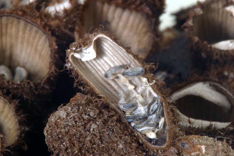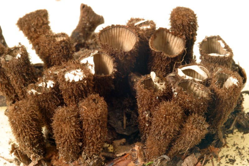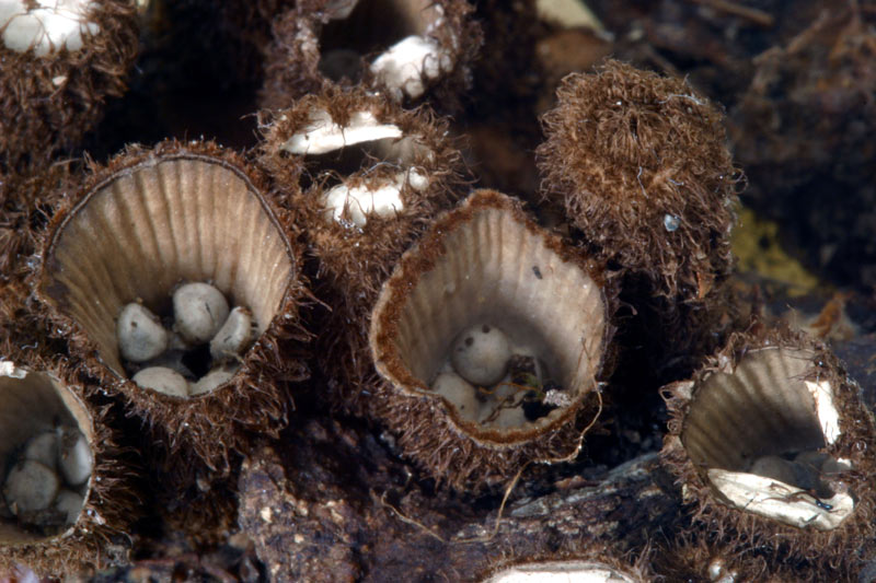si nota benissimo la parte interna del peridio "coppa" nettamente striato sul cui fondo sono disposti i peridioli, notiamo inoltre la parte esterma villosa e l'epifragma.