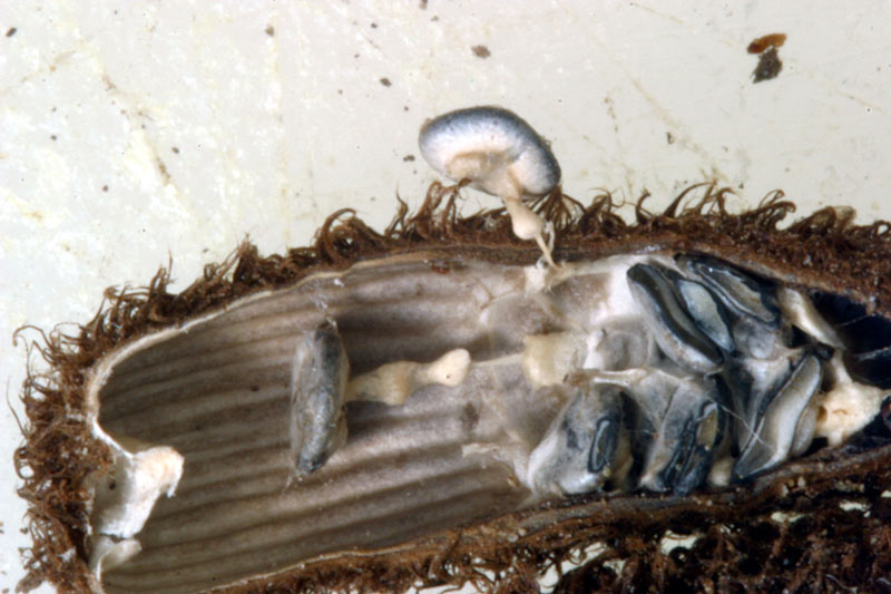 in questa immagine si notano alcuni peridioli appositamente staccati dal loro luogo d'origine, per evidenziare il funicolo, quella specie di codina che è situata sotto il peridiolo, a cosa serva e come funziona, andremo a verificarlo nella preossima foto.