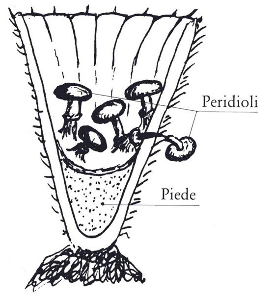 Questi peridioli non sono però liberi nella gleba, ma bensì immersi in una mucillagine oppure attaccati alle pareti del peridio tramite una specie di funicella molto lunga, formata da ife parallele e ritorte, a sua volta ripiegata in numerose spire racchiuse in una specie di borsellino.