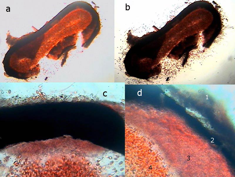 Nella sezione del peridiolo centrale notiamo tre strati di tre colori ben distinti che racchiudono la cavità centrale che a sua volta contiene l'imenio.