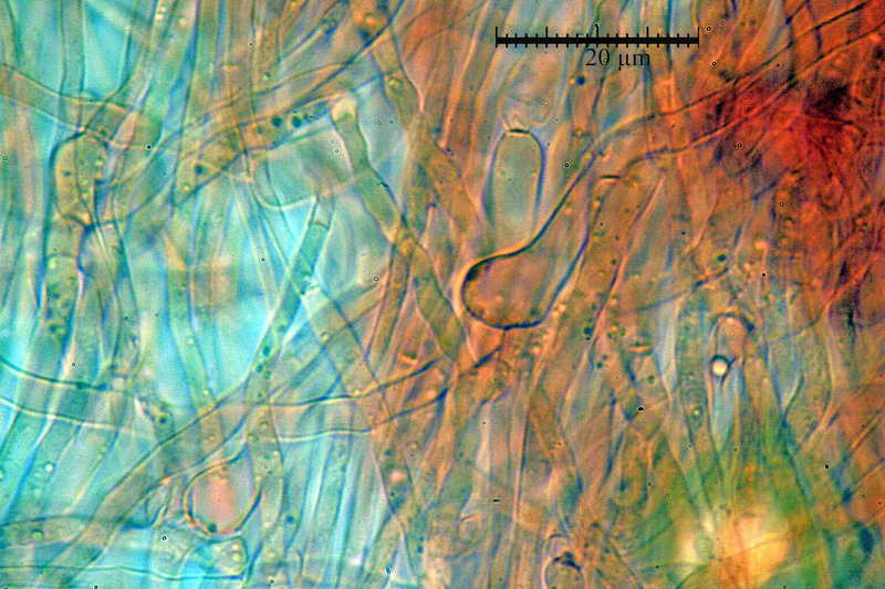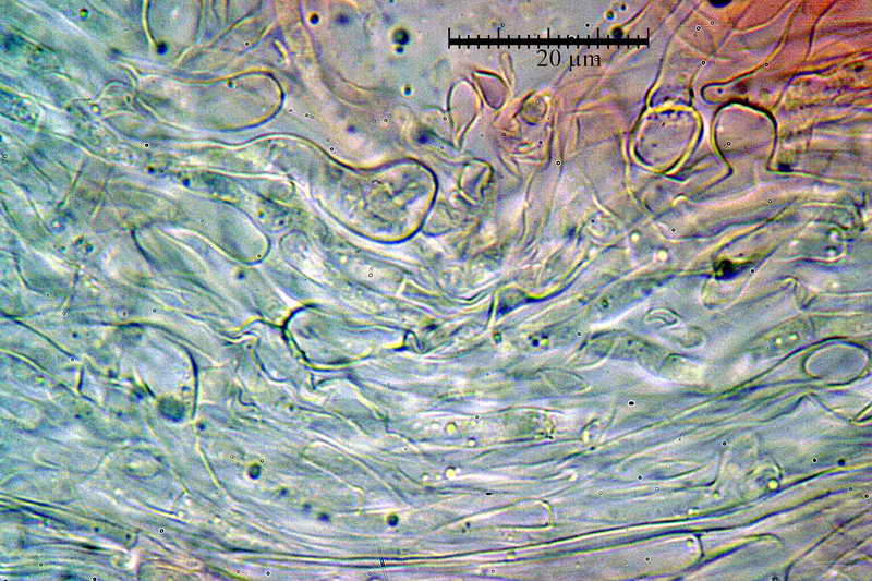 Trama delle pareti delle cellette con Ø, ife della columella con Ø 2,0-3,7 µm, in media 2,8 µm; ialine, gelatinizzate, cogofobe, prive di giunti a fibbia, settate e con forti rigonfiamenti alla congiunzione dei setti Ø 4,5-9,0 µm.