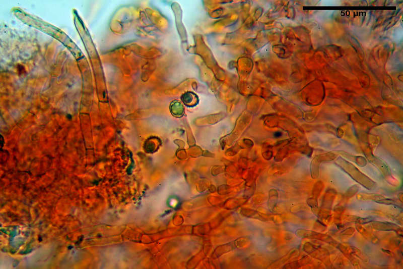 Pileipellis formata da peli cilindrici, settati, spesso con apice subclavato, spessi 3,5-5,5 µm, ife primordiali multisettate, di forma cilindrica con apice da attenuato a leggermente allargato 5-8 µm, al trattamento con Fucsina fenolica e relativo lavaggio e osservazione in Acido Cloridrico 10%, si sono dimostrate fortemente incrostati da granulazioni (tipo A), tutti gli elementi della pileipellis si sono dimostrati totalmente insensibili alla SBA. Subpellis di tipo pseudoparenchimatico formata da cellule tipo puzzle o anche moniliformi.
