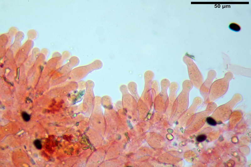 Cheilocistidi 32,1-43,6 x 9,5-12,3 x 6,1-8,7 µm, in media 37 x 11 x 7,5 µm, utriformi, fittamente disposti lungo il filo lamellare tanto da renderlo sterile, cellule sferopeduncolate assenti.Pleurocistidi assenti.