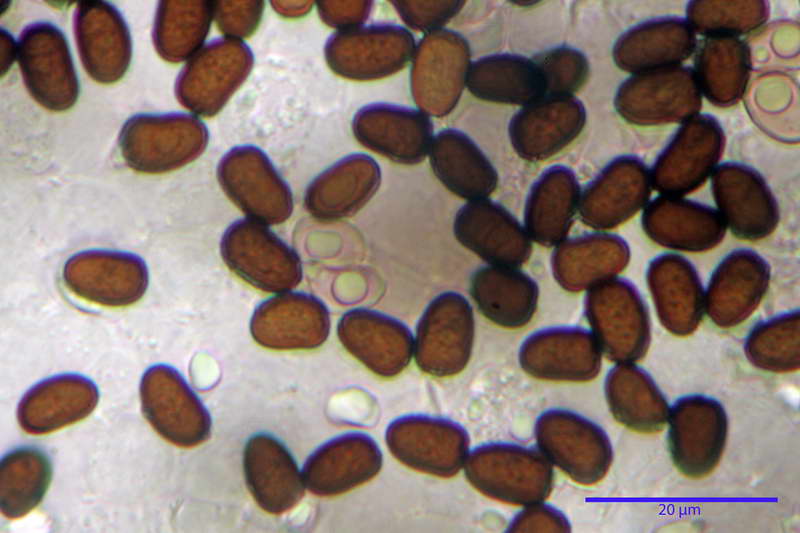 Spore (8,14) 8,59-9,71 (10,33) x (4,63) 5,10-5,69 (5,81) x (5,30) 5,67-6,52 (6,61) µm, in media 9,1 x 5,38 x 6,02 µm, Quoziente in proiezione laterale = (1,46) 1,59-1,79 (2,01), Q.m. = 1,69;