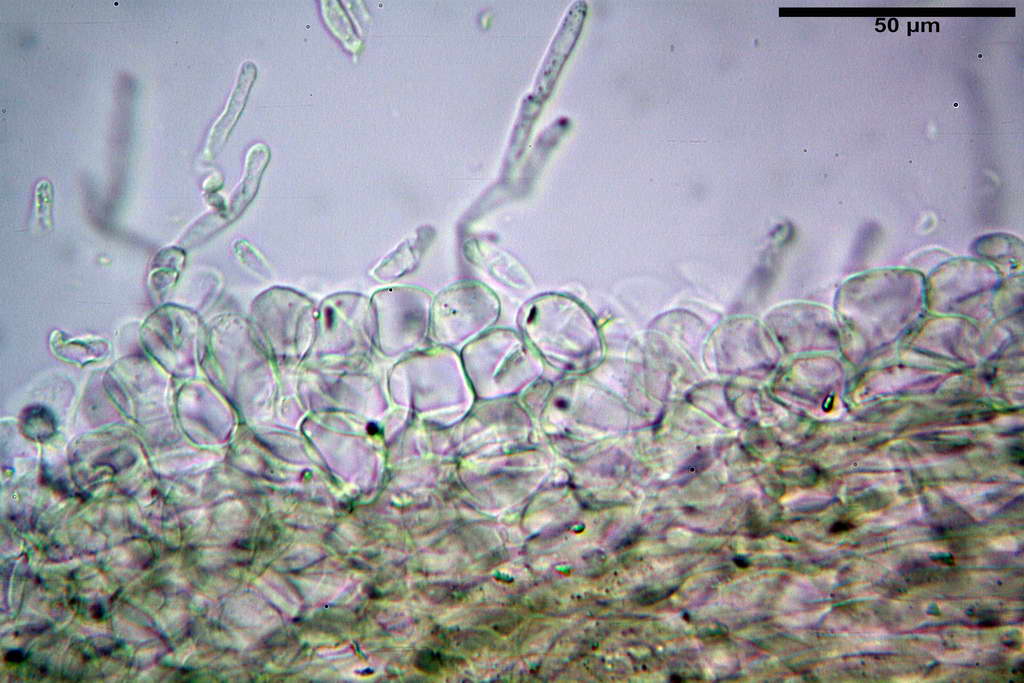 Pileipellis tipo imeniderma, formata da cellule clavate o sferopeduncolate, congofile, misuranti 20-39 x 10-21 µm; Q.m. = 1,8; Vol.m =3829 µm³, frammiste alle quali sorgono dei peli ifali pluriarticolati, con terminale cilindrico o inflato, disposti in tricoderma, congofobi, ifa terminale misurante 17-36 x 3,5-8,5 µm, Q.m. = 4,7; Vol.m = 423 µm³.