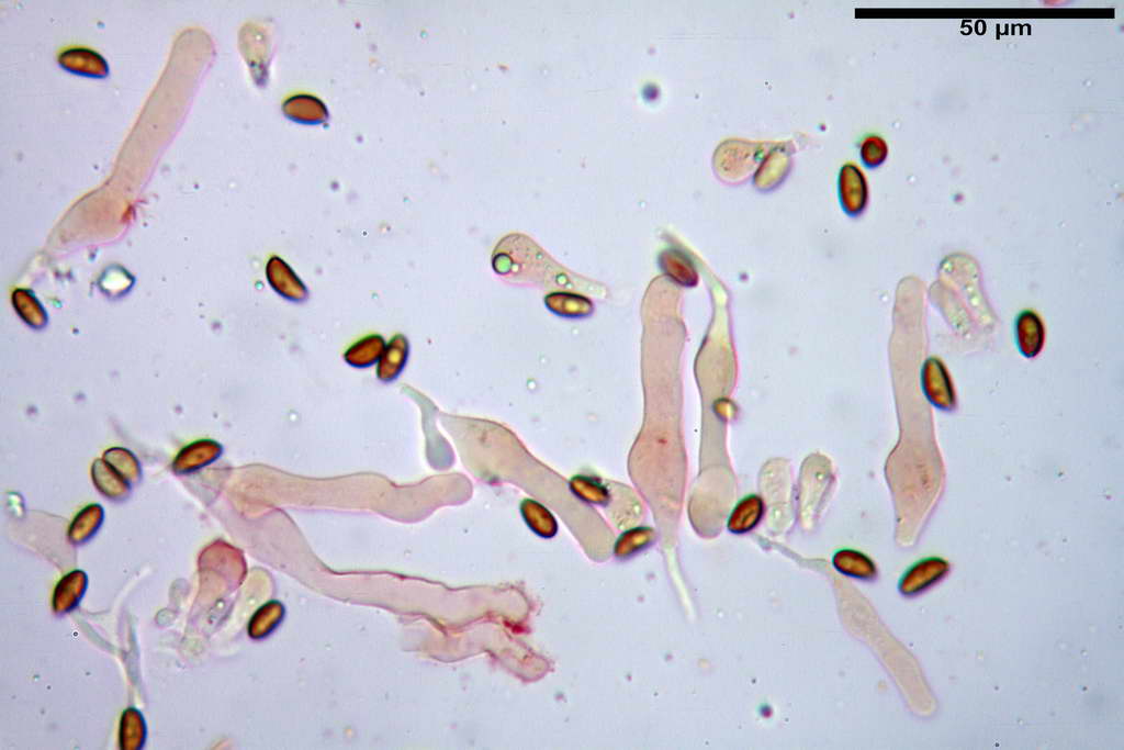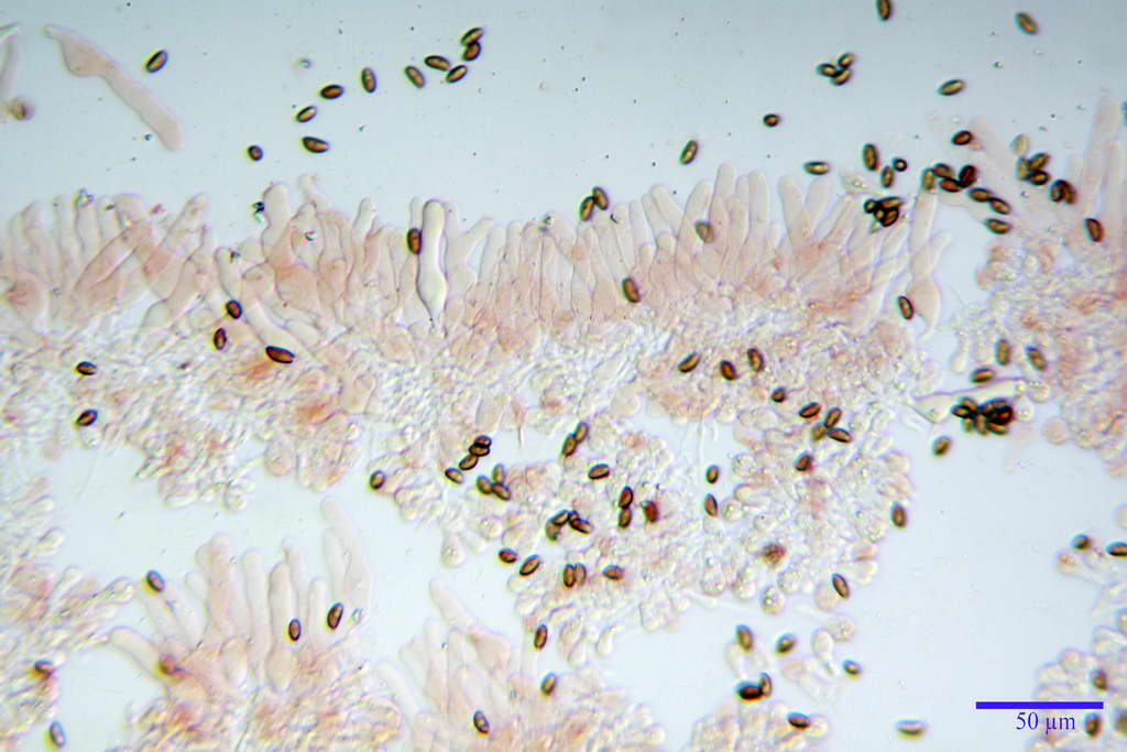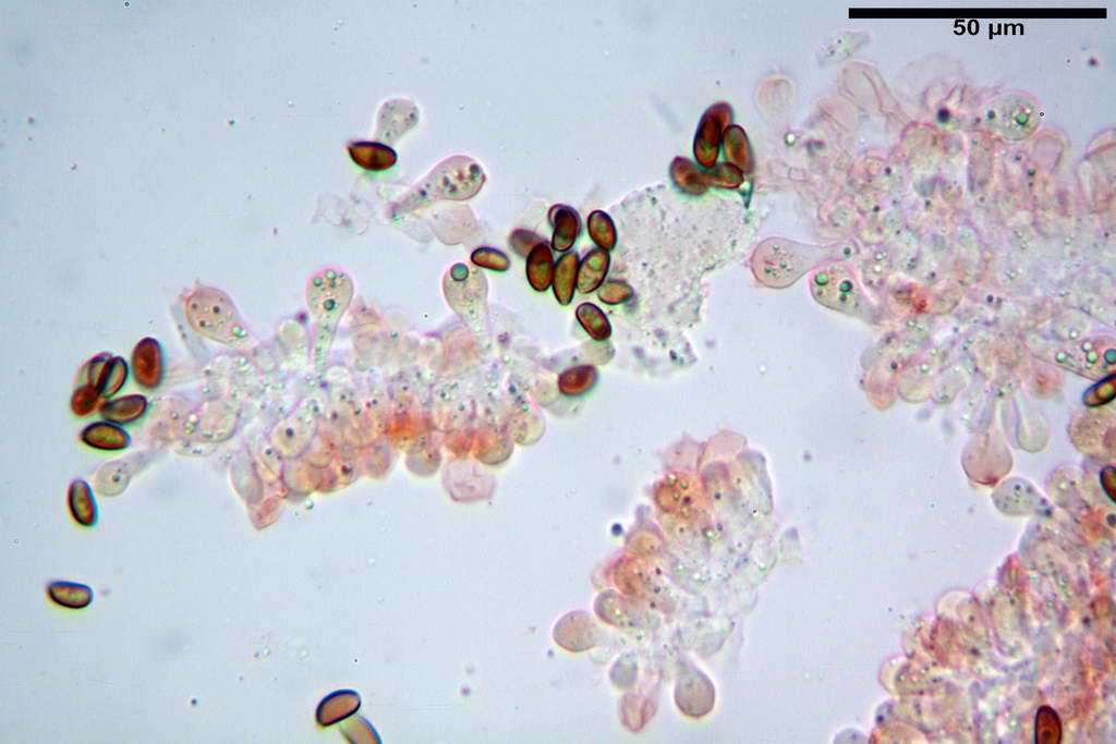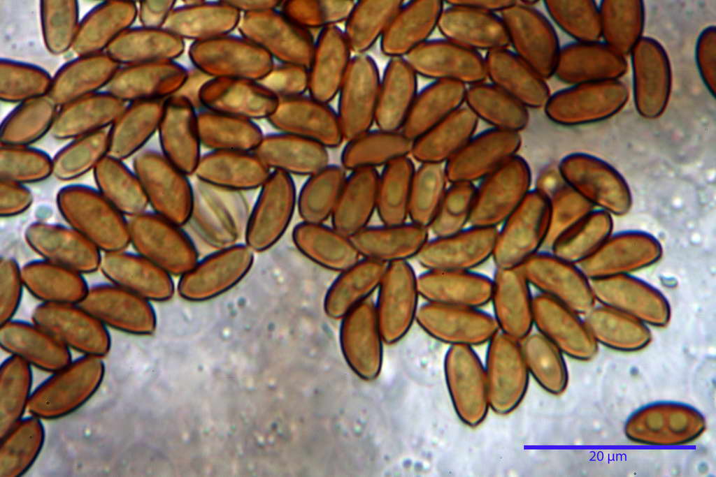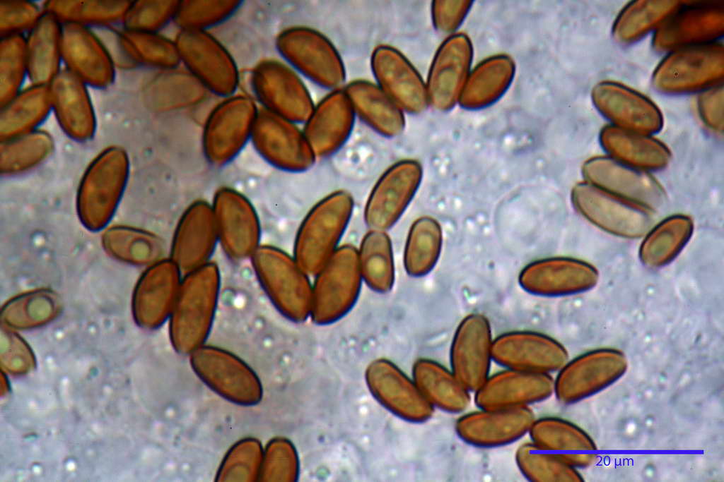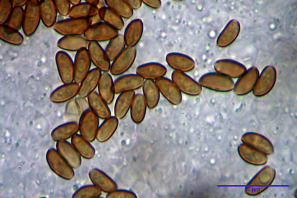 Spore (7,23 ) 8,61-10,47 (11,11) x (3,80) 4,27-5,11 (5,40) µm, in media 9,6 x 4,67 µm, Q. = 1,86-2,25 , Q.m. = 2,06, Vol. = 86-140 µm³, Vol.m = 110 µm³, subamigdaliformi in proiezione laterale, da strettamente ovoidi a subcilindriche in proiezione ventrale, lisce, parete leggermente inspessita (≤ 0,5 µm), rugginose in KOH 5%, poro germinativo largo fino a 1,2 µm, apiculo visibile.