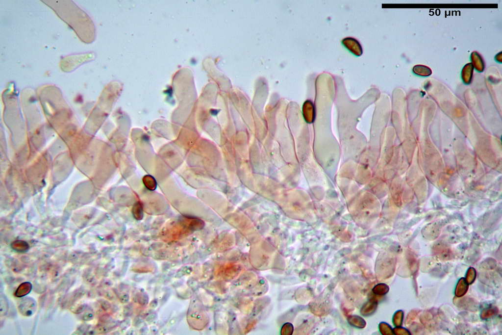 Cheilocistidi 34-70 x 6-12 µm, apice 5-10 µm, versiformi (in maggioranza), sublageniformi con collo robusto e flessuoso, apici di pari spessore o leggermente allargati, raramente ad apice bifido, in minor numero clavati o subcilindrici, filo lamellare sterile. Pleurocistidi non osservati.