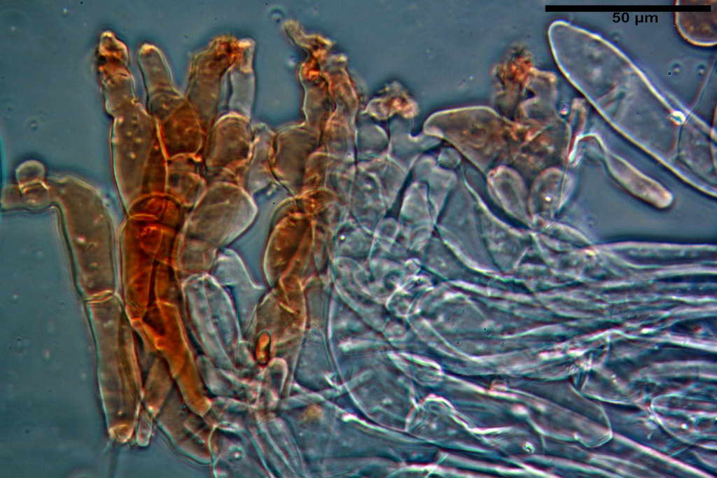 Caulocistidi (la misura si riferisce all’ultima cellula) 33-64 x 8-20 µm, apice 5-14 (bifidi 24) µm, nella forma sostanzialmente simili ai cheilocistidi, molto frequentemente con apice bifido, in minor numero clavati o subcilindrici, sormontanti una serie concatenata di 1-2 o più cellule inflate.