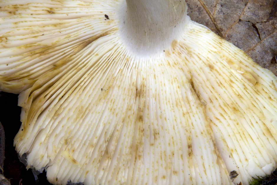 Lamelle adnato decorrenti, bifide, anastomosate all'inserzione con lo stipite, intramezzate da scarse lamellule di diversa lunghezza, strette, fitte, appena lardacee, fragili a maturità; all'inizio bianche, in età crema, più o meno picchiettate di macchiette rugginose, ingiallenti alla corruzione, filo lamellare intero, concolore.