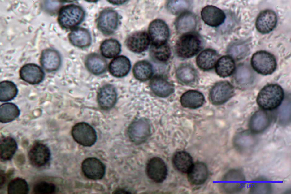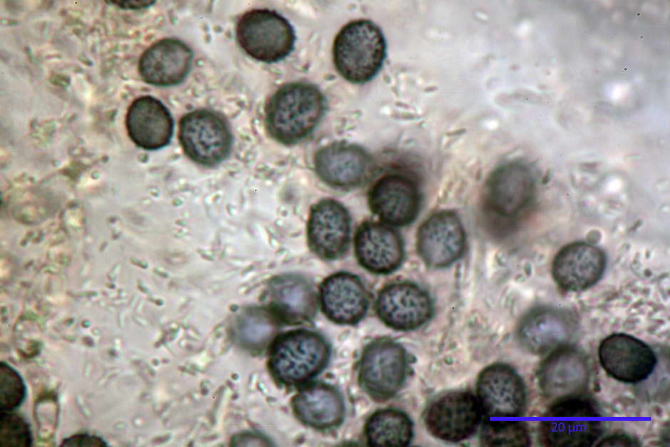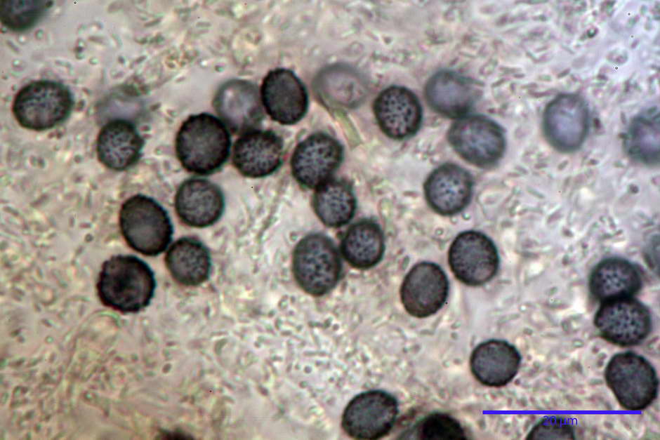 Spore (5,91) 6,51-7,78 (8,14) x (4,77) 5,38-6,24 (6,49) µm, in media 7,21 x 5,82 µm, Q. = (1,09) 1,151-1,32 (1,54); Q.m = 1,24; Vol. = (72) 97-153 (175) µm³ ; Vol.m = 128 µm³; obovoidi, ornate da basse verruche isolate, saltuariamente da basse connessioni non sempre ben visibili. Plaga ilare inamiloide.