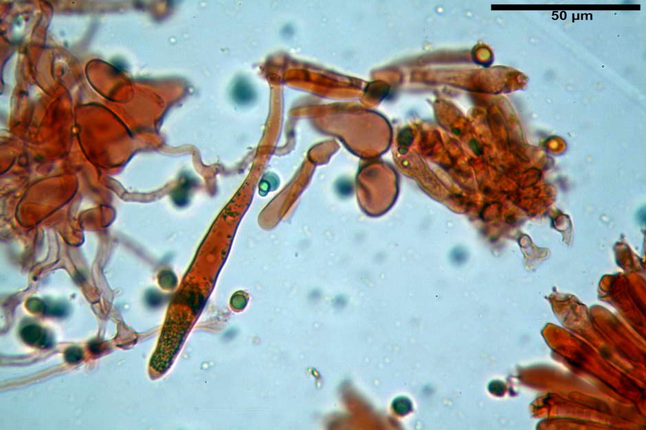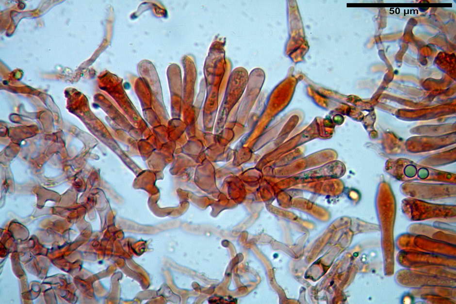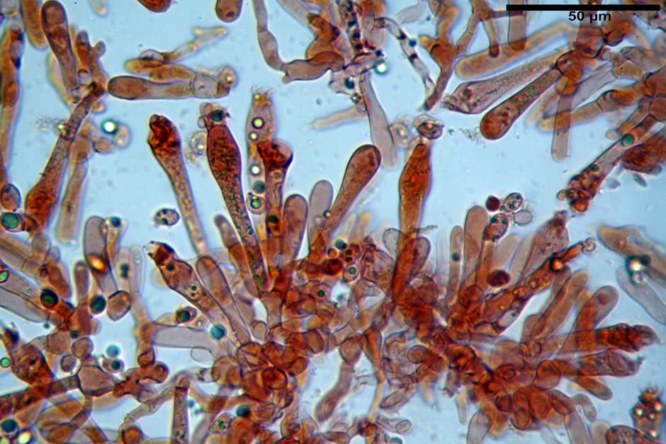 Cistidi imeniali 79-109 x 6-14 µm, in media 97,6 x 10,6 µm; Q.m = 9,5; Vol.m = 5849 µm³, sub-cilindrici, strettamente fusiformi, ad ogiva, raramente con corta appendice apicale.