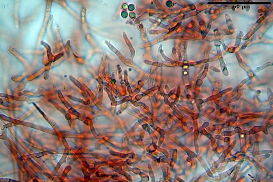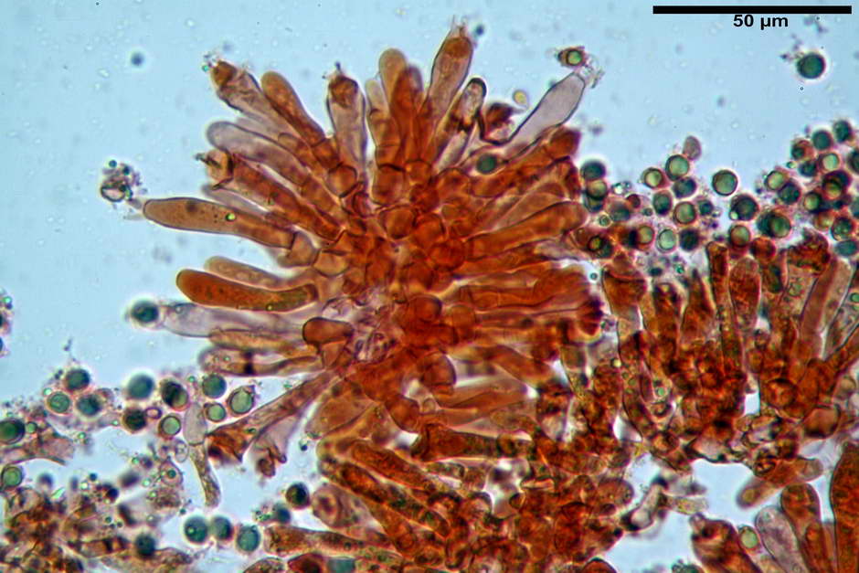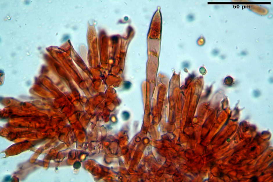 Pileipellis composta da peli ramificati e plurisettati, con articolo terminale cilindrico e apice da appena allargato a subulato, lungo 12-23 x 2,7-4,6 µm, elemento basale difforme, largo 5-7 µm, frammisti ai quali trovano posto scarsi dermatocistidi, larghi 3,3-5,4 µm, da subfusiformi a lievemente clavati, monosettati , con scarse inclusioni apicali leggermente rifrangenti osservate in H2O, positivi alla SV. Presenti dei crini aghiformi, a parete spessa, lunghi fino a 100 µm, larghi alla base 2,7-4,0 µm, numerosi nella zona discale, più scarsi altrove.