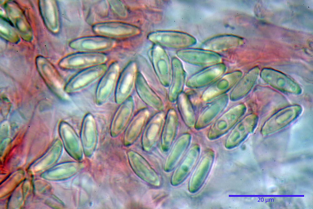 Spore (9,7) 10,7- 11,22 -13,1 (14,5) x (3,2) 3,8- 4,16 -4,6 (4,9) µm; Q. = (2,4) 2,6- 2,74 -3,2 (4,2); Vol. = (71) 88- 95 -137 (171) µm³; da lungamente ellissoidali a strettamente fusoidi, da leggermente verdoline a ialine, perisporio trasparente, corrugato, alle volte leggermente alato o leggermente distaccato, residuo sterigmale breve, non sempre evidente.