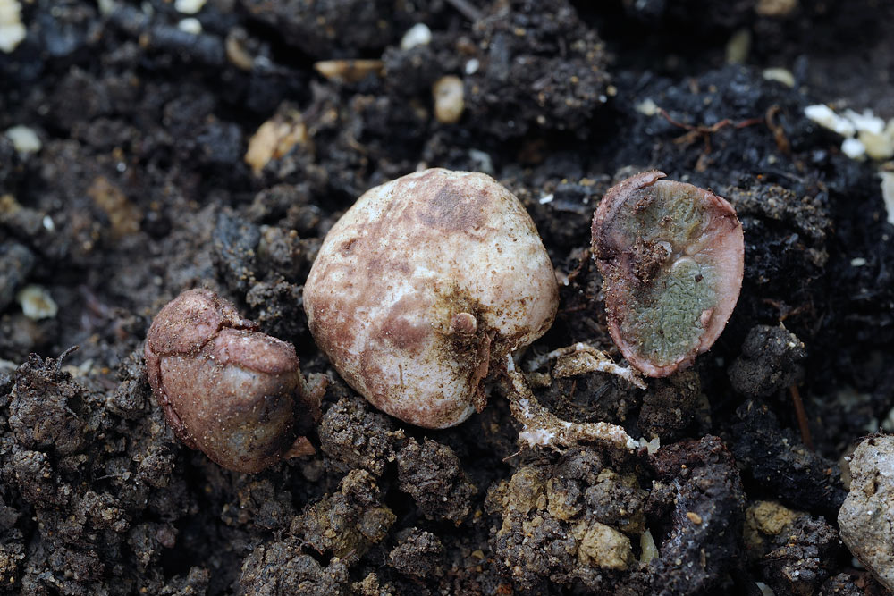Basidiomi con diametro fino a 10 mm, subgloboso, all’inizio di colore biancastro, presto rosato-rossastro, poi ocraceo ed infine brunastro, grigio negli exsiccata, lisci o con lievi residui miceliari ifali, provvisti di uno o due corti cordoncini miceliari di colore bianco. Odore e Sapore poco intensi.