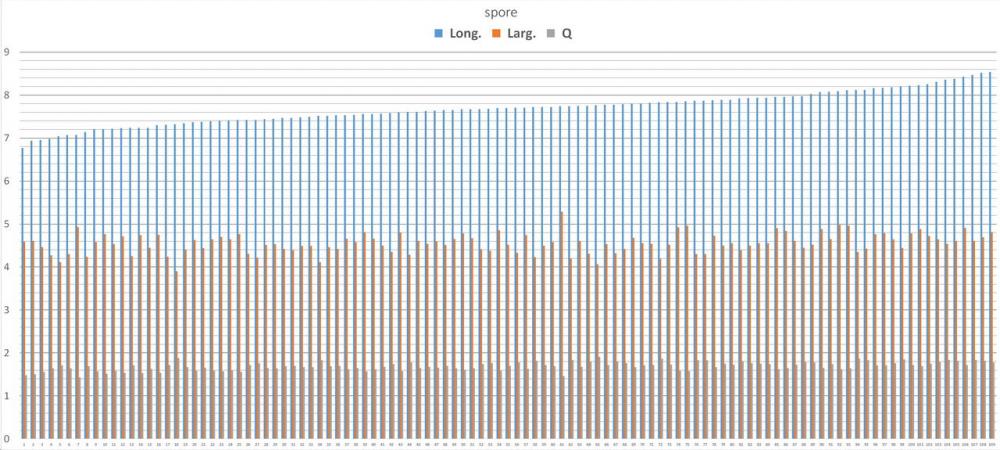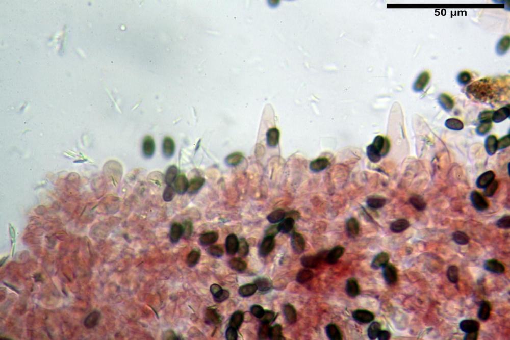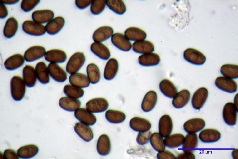 Spore (6,7) 7,2 - 7,69 - 8,2 (8,5) x (3,9) 4,2 - 4,55 - 4,8 (5,2) µm, Q. = (1,4) 1,5 - 1,72 - 1,8 (1,9); Vol. = (58) 71 - 84,6 - 98 (113) µm3, faseoliformi in proiezione laterale, da subellittiche a subovoidi in proiezione frontale. Lisce, spesso evidenzianti una grossa guttula centrale; parete spessa fino a 0,5 µm, poro germinativo 0,8 - 0,94 - 1,2 µm, appendice ilifera poco evidente. Marrone-rossastre in H2O, bruno-verdastre in KOH 6%.