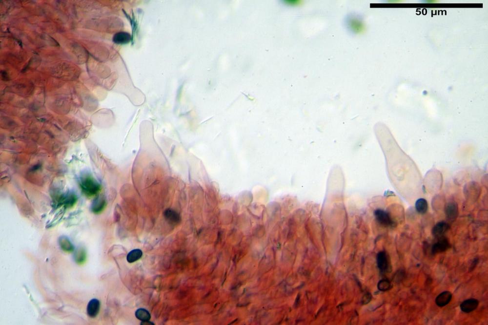 Cheilocistidi (30,3) 32,3 - 40,2 - 50,4 (57,5) x (11,4) 12,5 - 14,4 - 16,8 (19,1) µm, Q. = (2,2) 2,3 - 2,9 - 3,2 (3,7); Vol.m.= (2176) 2934 - 3325 - 7231 (11064) µm3, in maggior parte da strettamente fusiformi a fusiformi con apice acuto, più raramente strettamente utriformi con apice ottuso. Ialini. Abbastanza numerosi, frammisti ai paracistidi. Filo lamellare sterile.