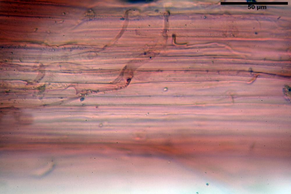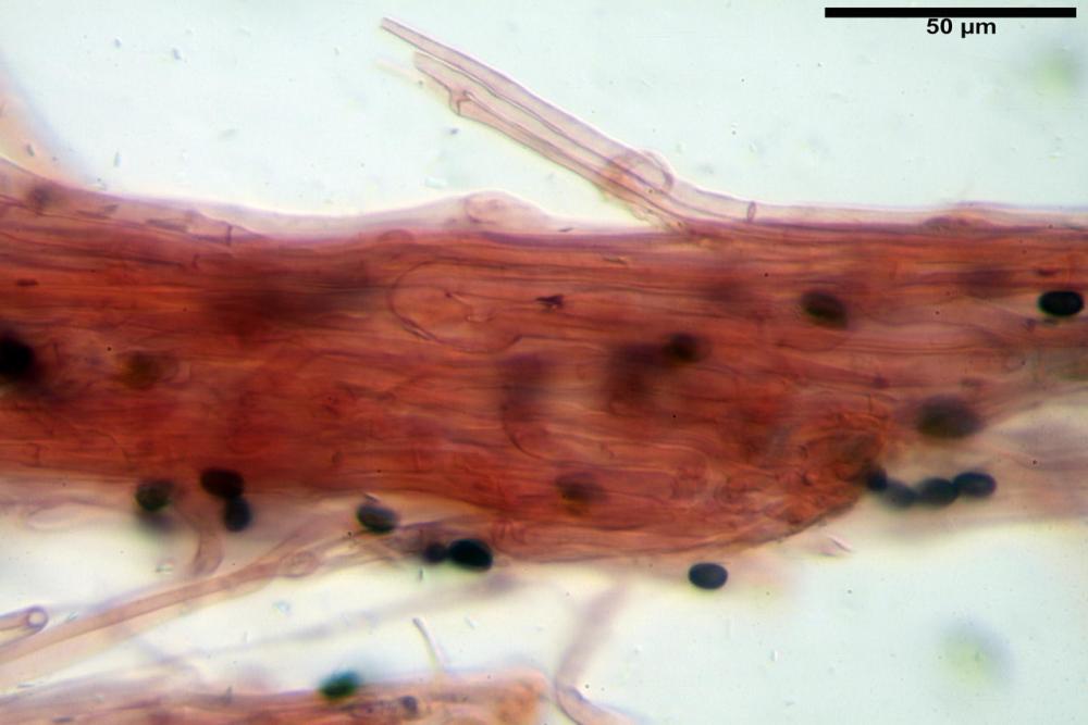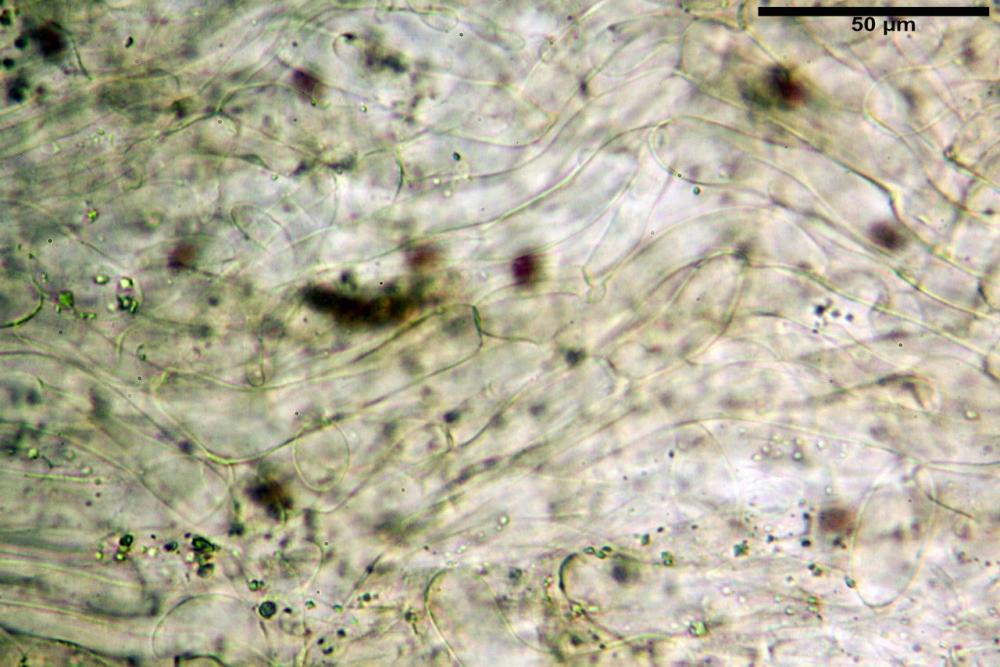 Trama lamellare regolare, ife con diametro (5,02) 6,7 - 10,1 - 13,7 (13,9) µm, ialine o leggermente pigmentate di giallo in H2O.