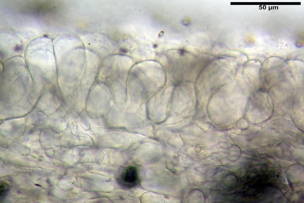 Pileipellis (45,1) 48,1- 52,9 - 58,7 (59,6) x (20,2) 24,9 - 29,2 - 33,2 (36,1) µm, Q. = (1,4) 1,5 - 1,9 - 2,1 (2,2); Vol. = (9728) 17353 - 25764 - 31426 (40803) µm3, formata da un’imeniderma con transizione in epitelio, composta da cellule più o meno pedicellate, ialine. Pileocistidi non osservati.