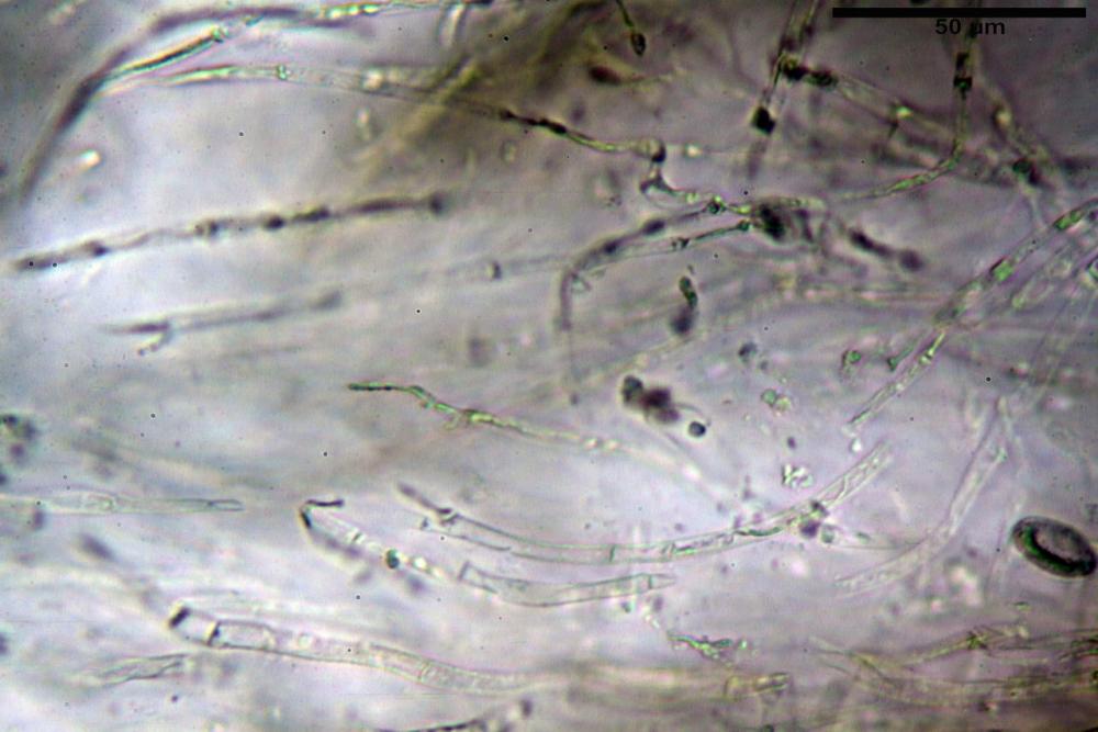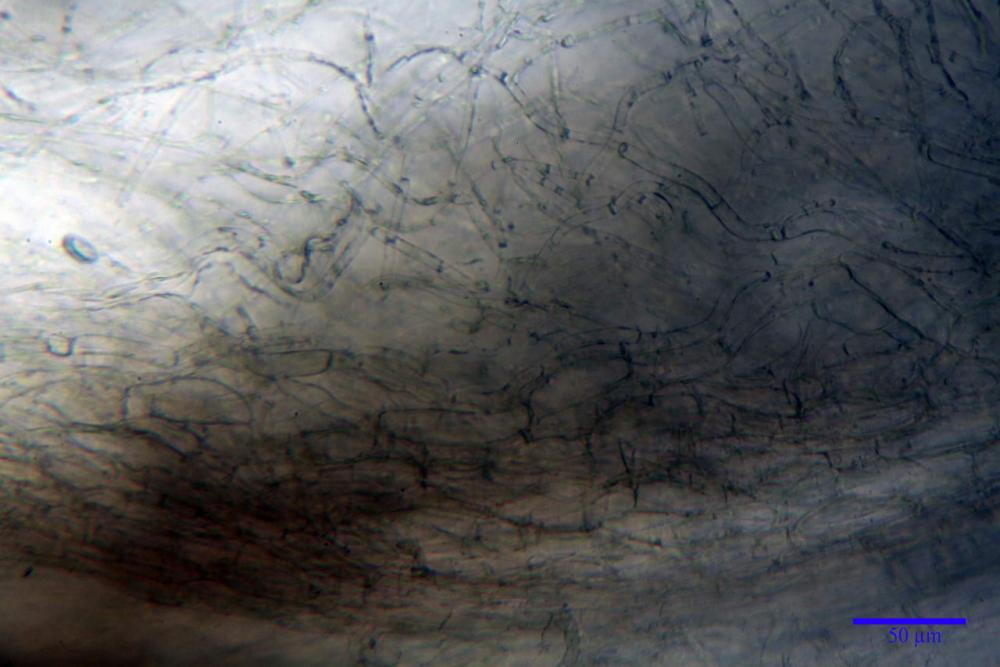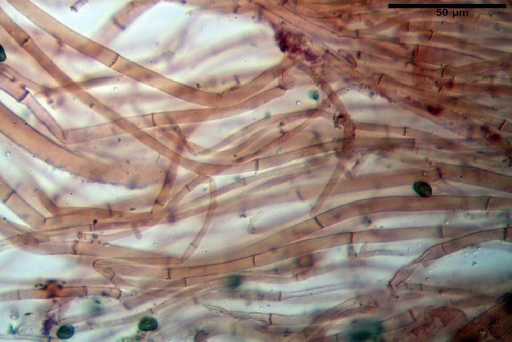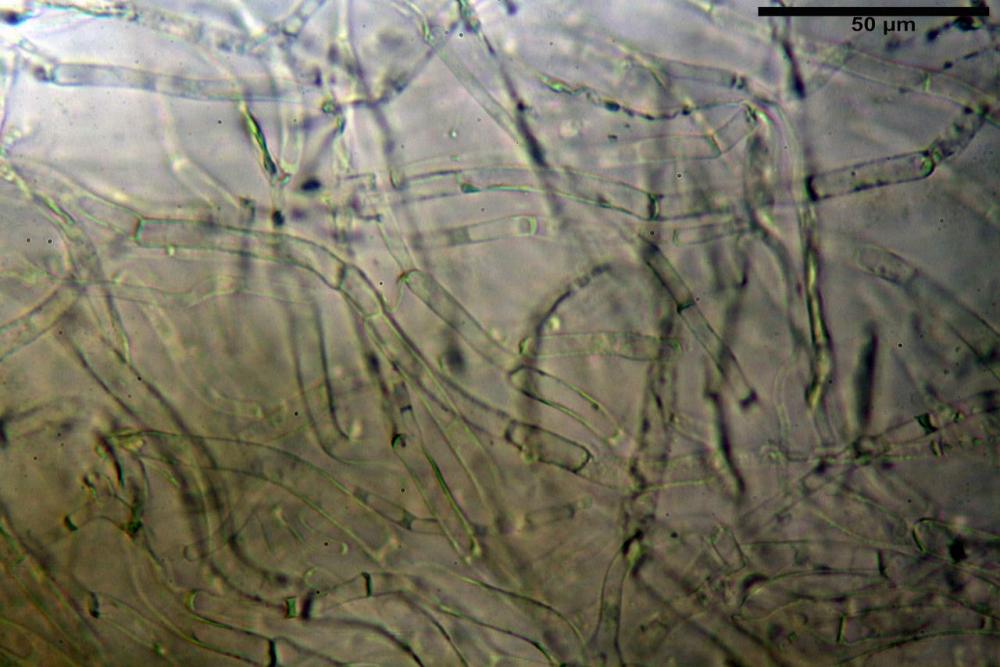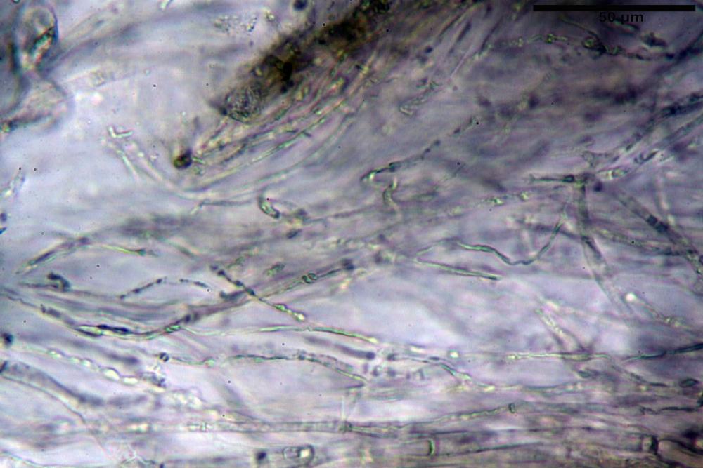 Trama lamellare regolare, ife con diametro 3,5 - 10,0 µm, ialine.