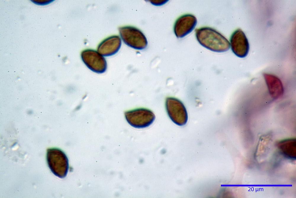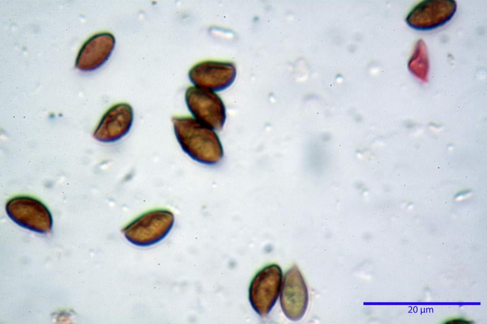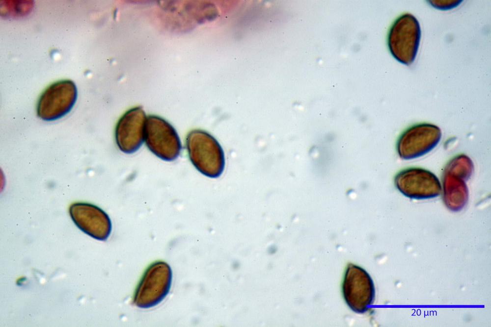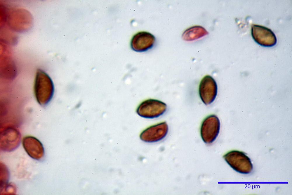 Spore (7,38) 7,92 - 8,56 - 9,23 (10,30) x (4,41) 4,56 - 5,01 - 5,34 (5,87) µm, Q. = (1,5) 1,6 - 1,68 - 1,8 (1,9); Vol. = (78) 89 - 107 - 135 (180) µm3, amigdaliformi in proiezione laterale, da ellittiche a subovoidi in proiezione frontale, verrucose, ornate da basse verruche libere o unite in brevi creste, plaga soprailare evidente, parete spessa, appendice ilifera ben evidente, ialina, prive di poro germinativo. Marrone-rossastre in H2O.