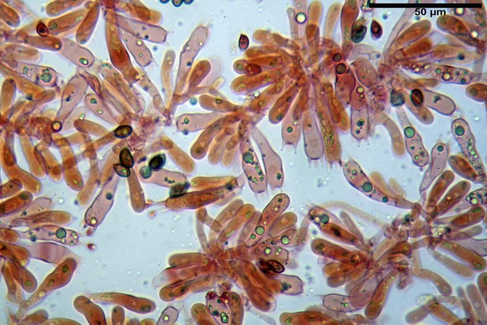 Caulocistidi (10,3) 10,7 - 13,4 - 17,8 (28,0) x (1,1) 1,2 - 1,9 - 2,2 (2,3) µm, Q. = (4,7) 4,8 - 6,1 - 11,2 (12,7); Vol.m.= (8,8) 9,8 - 25,3 - 41,8 (71,4) µm3, strettamente cilindrici con apice capitulato largo (1,2) 1,3 - 2,1 - 2,5 (2,7) µm, non settati, abbondantissimi.