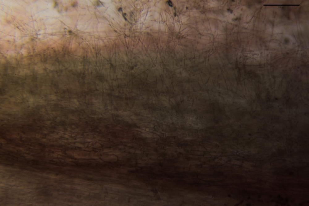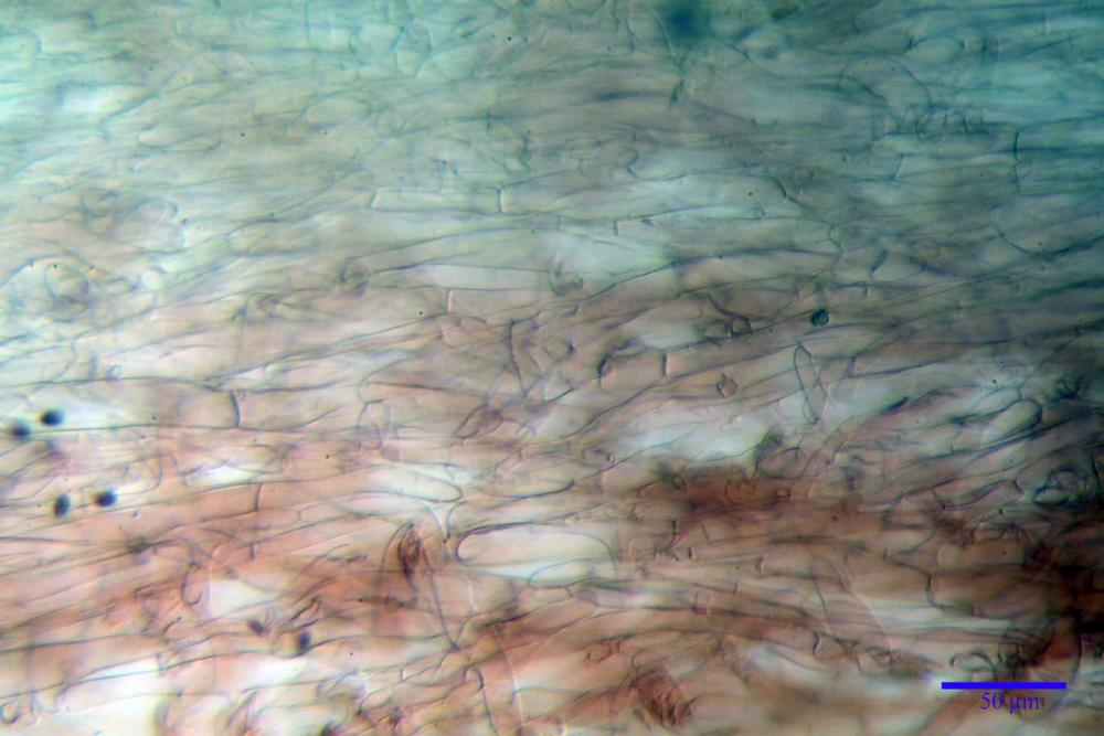 Suprapellis spessa (217) - 243 - (445) µm, formata da ife cilindriche con diametro (2,4) 2,8 - 3,8 - 5,5 (5,6) µm, finemente incrostate, ialine.