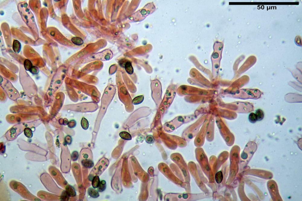 Basidi (27,2) 27,8 - 31,8 - 36,0 (37,2) x (5,6) 6,4 - 7,7 - 8,9 (8,9) µm, Q. = (3,1) 3,3 - 4,1 - 5,2 (5,8); Vol. = (557) 723 - 1054 - 1307 (1364) µm3, clavati, tetrasporici, raramente bisporici, ialini.