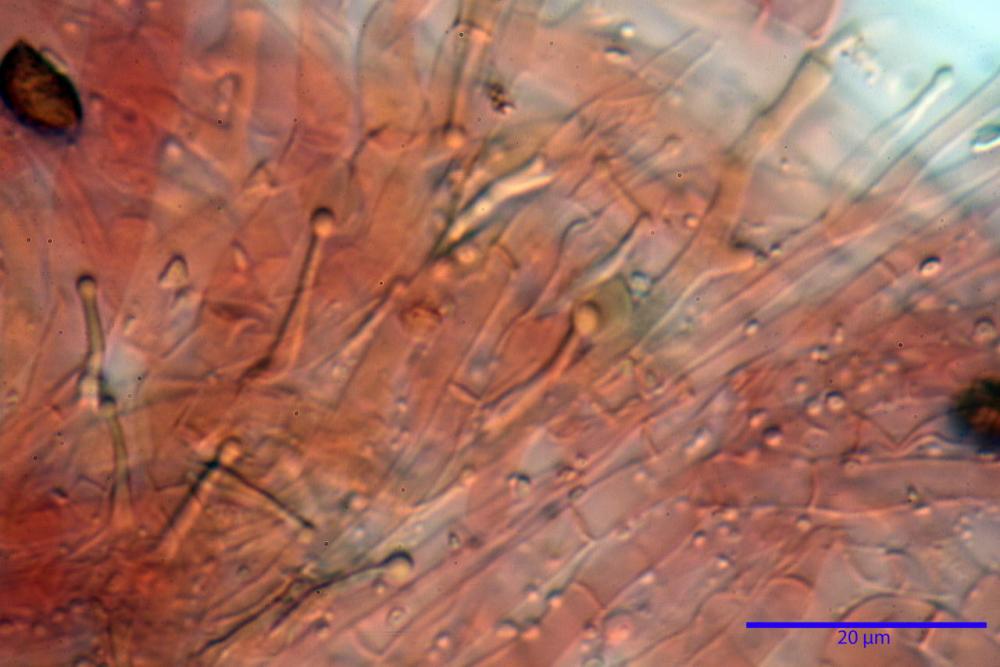 Subpellis composta da ife cilindriche, con diametro (7,3) 7,8 - 14,8 - 17,6 (18,1) µm, ialine o leggermente pigmentate. Pileocistidi non osservati.