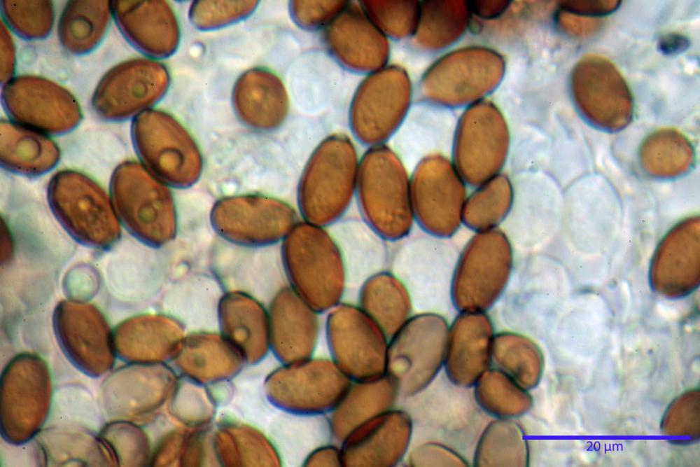 Spore (9,66) 10,38 - 11,085 - 12,24 (13,16) x (5,66) 5,91 - 6,22 -6,62 (7,16) µm, Q. = (1,59) 1,67 - 1,84 - 1,91 (2,05); Vol. = (162) 196 - 226 - 273 (353) µm3, da ellissoidi a subamigdaliformi in proiezione laterale, largamente ellittiche in proiezione frontale, apparentemente lisce al microscopio ottico, parete spessa 0,7 - 0,85 - 1,0 µm, poro germinativo centrale con diametro (1,1) 1,2 - 1,73 - 1,74 (1,9) µm, apiculo evidente. Al microscopio ottico di colore marrone-rugginoso con KOH 2%.