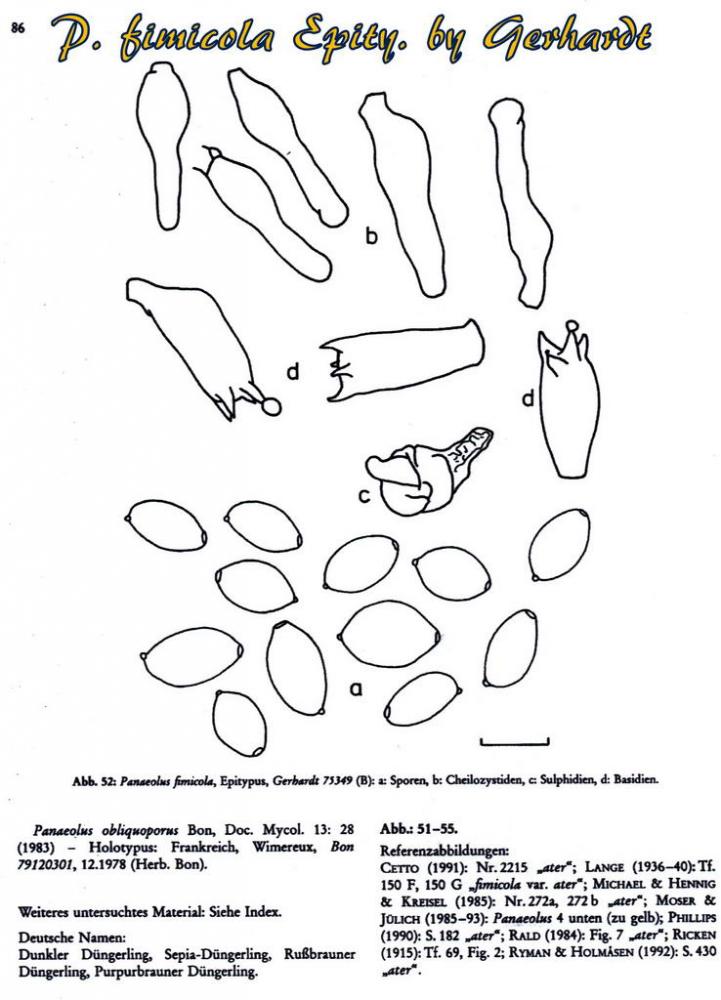 Spore: essendo tipico il posizionamento delle spore di Panaeolus di piatto (posizione ventro/dorsale è l’espressione usata dal sottoscritto, che non comprende perché la definizione della visione di ”pancia” o di ”dorso” debba chiamarsi frontale, che caso mai sarebbe la visione dalla parte dell’apiculo??) essendo quella la dimensione più larga e piatta, si è provveduto ad effettuare la misurazione laterale e ventrale delle stesse. VISTA LATERALE: (13.24) 13.64 - 14.66 (15.19) × (6.95) 7.34 - 7.86 (8.26) µm; Q = (1.65) 1.74 - 1.98 (2.06) ; N = 6; Me = 14.13 × 7.60 µm ; Qe = 1.86. VISTA VENTRALE: (11.47) 11.84 - 14.32 (14.67) × (7.07) 8.10 - 8.71 (8.77) µm; Q = (1.31) 1.39 - 1.80 (2.02) ; N = 12; Me = 13.41 × 8.33 µm ; Qe = 1.62. decisamente appiattite, da ellissoidi a subamigdaliformi. Lisce, opache, nerastre in H2O, marroni in KOH, parete larga fino a 1,40 µm, poro germinativo centrale, alle volte leggermente eccentrico, largo fino a 2,97 µm. molto prominente, così come l’apiculo è ben sporgente.